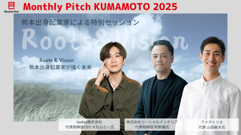 近年、全国各地でのスタートアップの盛り上がりが加熱し地域経済活性化への期待が高まるなか、「Monthly Pitch」で培ったエコシステムの輪をさらに各地へ発展させるべく、年に1度地方での開催を行ってまいりました。これまで実施した滋賀県、静岡県、高知県に続き、4年目となる今年は熊本県にて「Monthly Pitch KUMAMOTO 2025」を開催いたします。