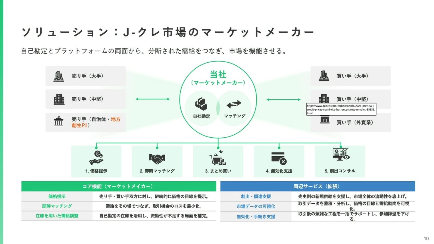 他社がマーケットプレイスへの「登録」を促すだけなのに対し、カーボンリンク社は、これら地方自治体の在庫を自ら買い上げます。自治体の販売・事務負担を解消しつつ、需要が逼迫する市場へクレジットを確実に供給していく狙いです。