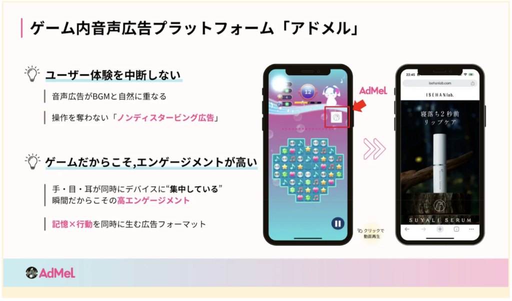 AdMel社が提供するのは、ゲームやアプリの体験を妨げない 「ノンディスタービング広告」のためのシステム。例えばスマホアプリで遊んでいる最中に、プレイを中断することなく音声でメッセージを伝えることが可能です。ゲームプレイ中はスマホに目や耳のすべてを集中させているため、ユーザーの意識が広告に向き、最後までメッセージを聞いてもらえるという特徴があります。画面上のバナーをタップすれば、ユーザーとさらなるコミュニケーションへの誘導も可能です。