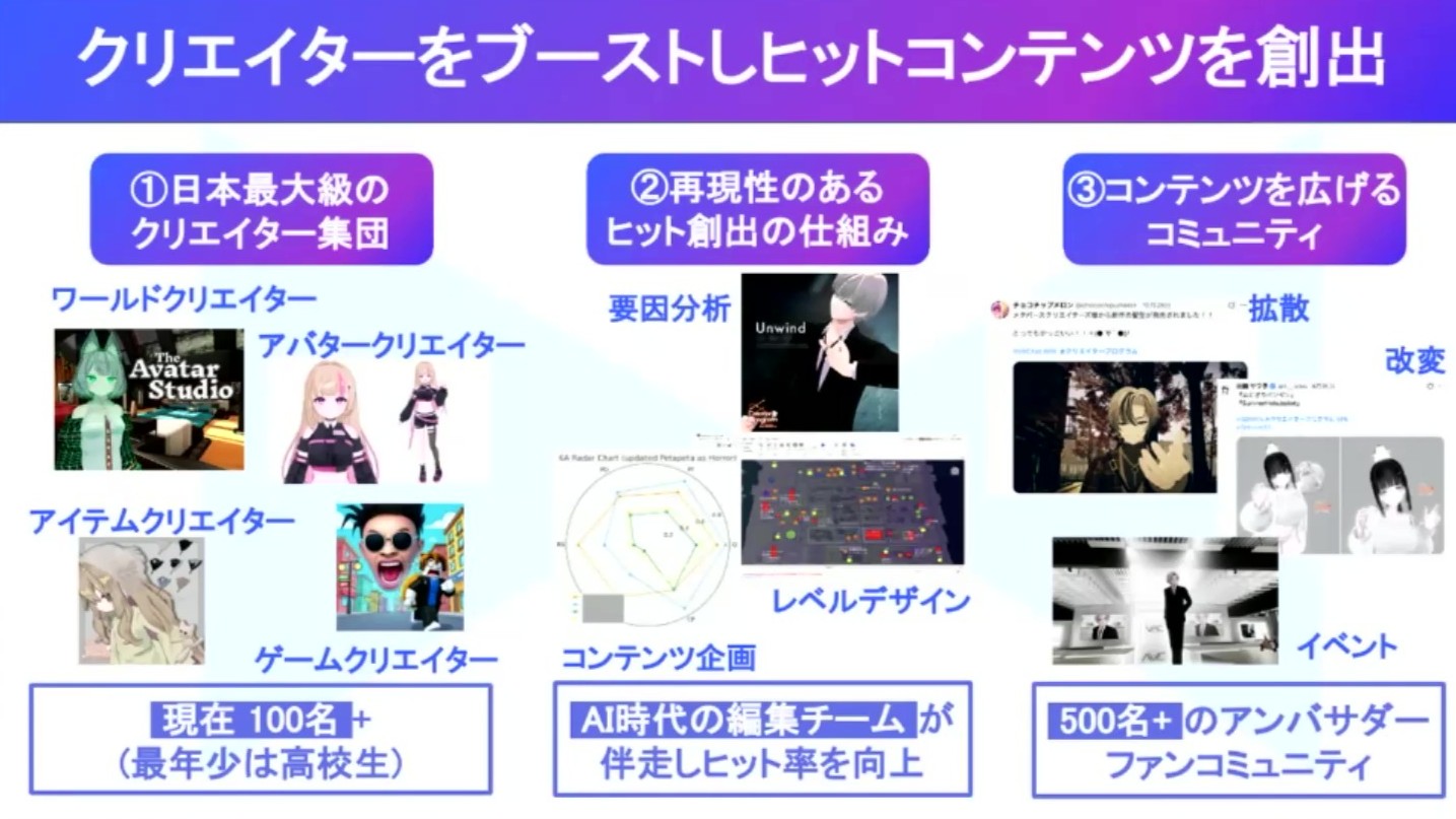 メタバースクリエイター専門のプロダクション事業を展開するのはメタバースクリエイターズ社。クリエイター集団、再現性のあるヒット創出の仕組み、コミュニティを強みとして、急成長するメタバース市場の中で、アバターやファッションなどの3Dモデル販売や、ゲームを含めた体験を提供していきます。