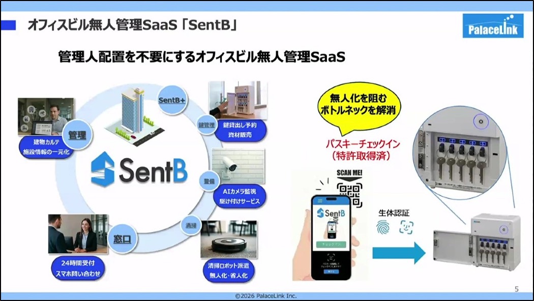パレスリンク社が開発するのは、無人でのビル運営を可能にするサービス「SentB(セントビー)」です。