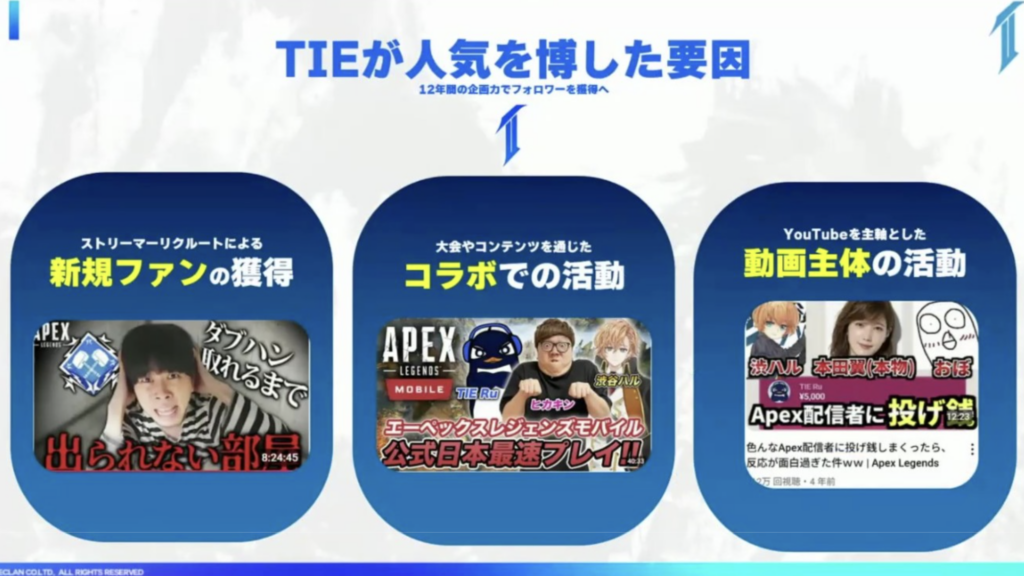 TIEの人気の要因は、ストリーマーのリクルートによる新規ファンの獲得、大会やコンテンツを通じたコラボ活動など。YouTubeでの圧倒的な登録者数による新規ファンの獲得や、他チームにはない実写動画の展開、それに伴う女性ファン比率の向上が、競合に対する強みとなっています。