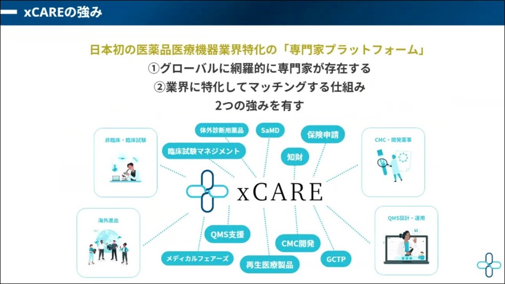 医薬品医療機器業界に特化した、業務委託による専門家マッチングプラットフォーム「xCARE(クロスケア)」を開発するのはxCARE社。